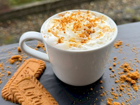 A cozy cup of hot chocolate mixed with salted caramel and that classic Biscoff cookie flavour. Sweet, a little salty, and seriously delicious.