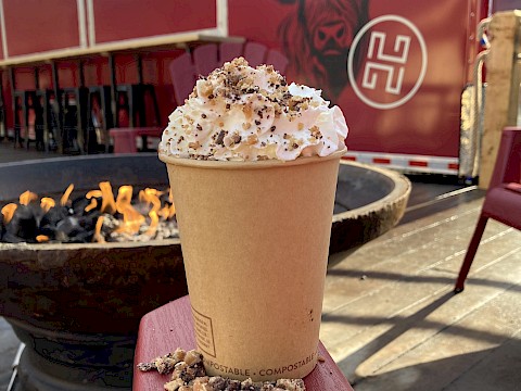 - Topped with coconut whipped cream, pirouline & baby marshmallows