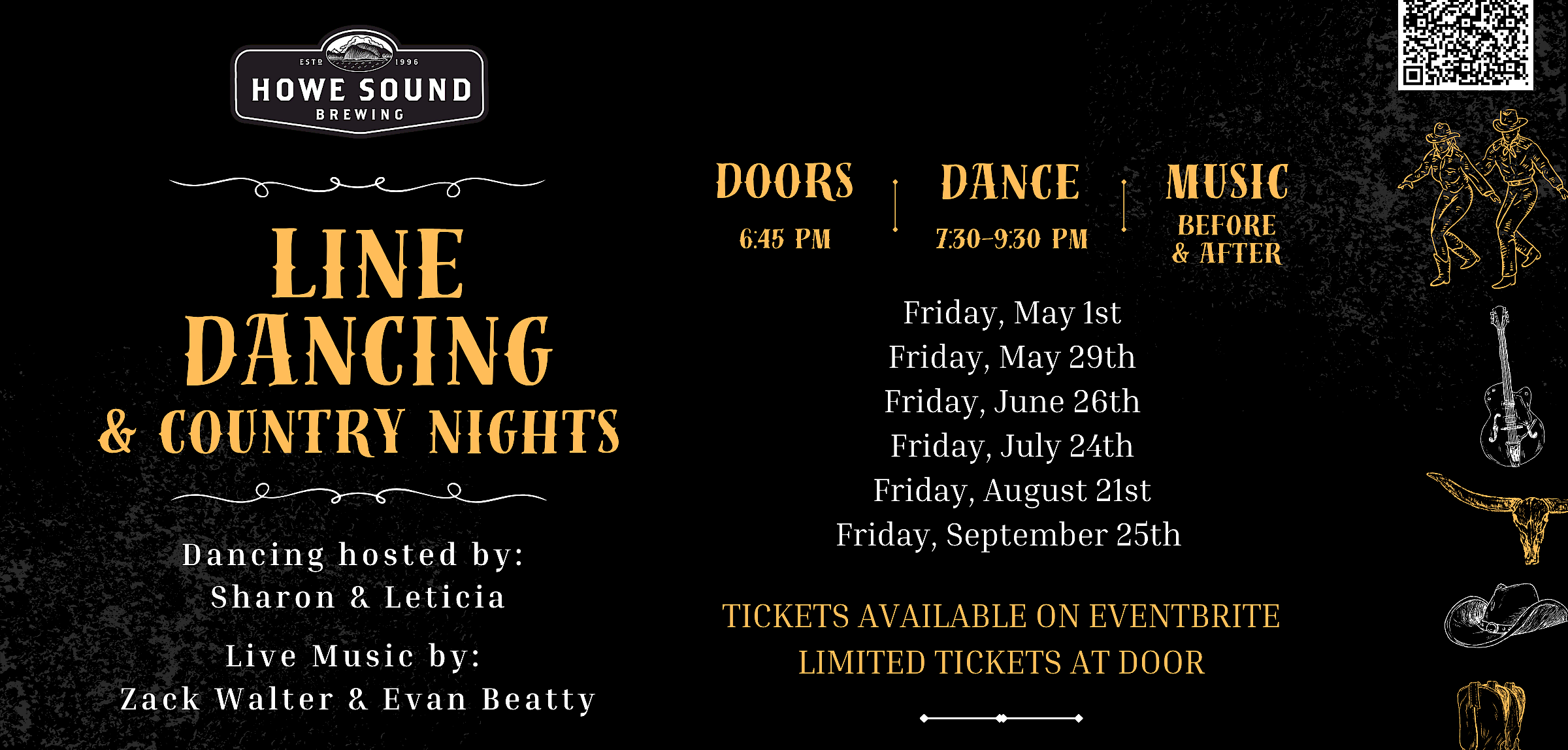 We’re bringing back Line Dancing & Country Nights at Howe Sound Brewing, running monthly May–September! Learn with Sharon & Melissa, then enjoy live music from Zack Walter & Evan Beatty.