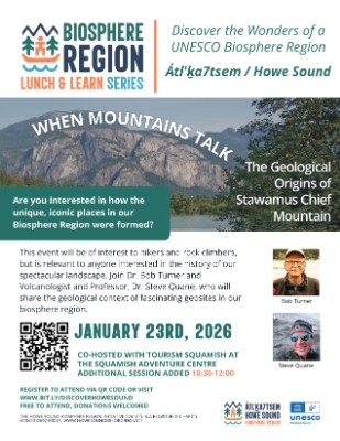 This event is for those interested in geology and how these unique, iconic places in the Howe Sound Biosphere Region were formed. This event will be of particular interest to hikers and rock climbers, but is relevant to anyone interested in the history of our spectacular landscape. It will shed new light on the familiar yet infamous Stawamus Chief, and what makes these landmarks legendary for the Sḵwx̱wú7mesh People.
