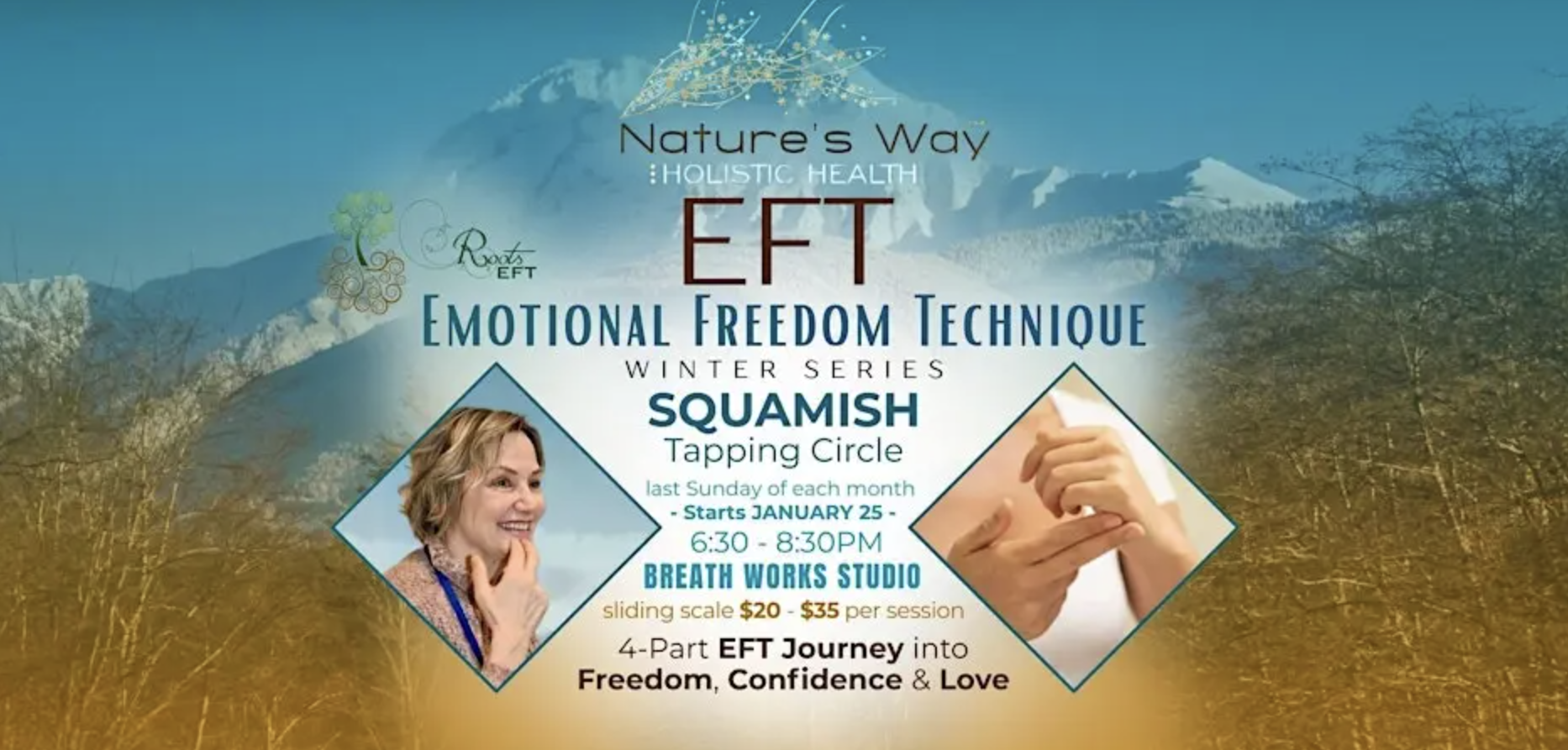 Nature's Way Holistic Health has created the Winter Series of the NEW Squamish EFT Tapping Circle (Emotional Freedom Technique). EFT Tapping is a powerful science-backed first aid and life-changing tool to release stress, anxiety, and negative emotions. In this circle, you will come together to tap on our meridian points while giving voice to what no longer serves you. Clear what disturbs you most, from the roots. Improve your life and relationships. Manifest your dreams with confidence.
